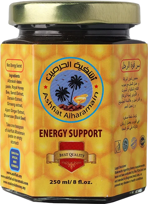 Ashfiat Alharamain is a powerful and revitalizing blend specifically crafted to naturally enhance and elevate energy levels throughout the body. Recognized for its ability to serve as an effective natural energy booster, this unique formula is carefully composed of a selection of potent, nutrient-rich ingredients known for their healing and energizing properties. Among these ingredients are ginseng roots, renowned for their adaptogenic qualities that help combat fatigue and improve stamina; Arabian date paste, which provides a natural source of energy and essential nutrients; black seed extract, celebrated for its immune-boosting and restorative properties; and royal honey, a rich source of enzymes and natural sugars that further support vitality.Â